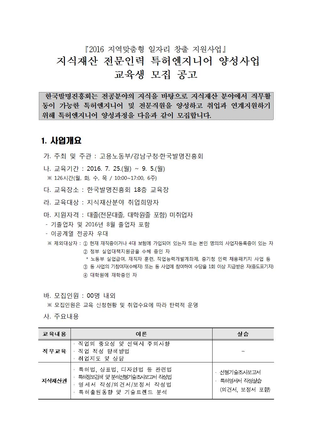지식재산 전문인력 특허엔지니어 양성사업 교육생 모집 공고