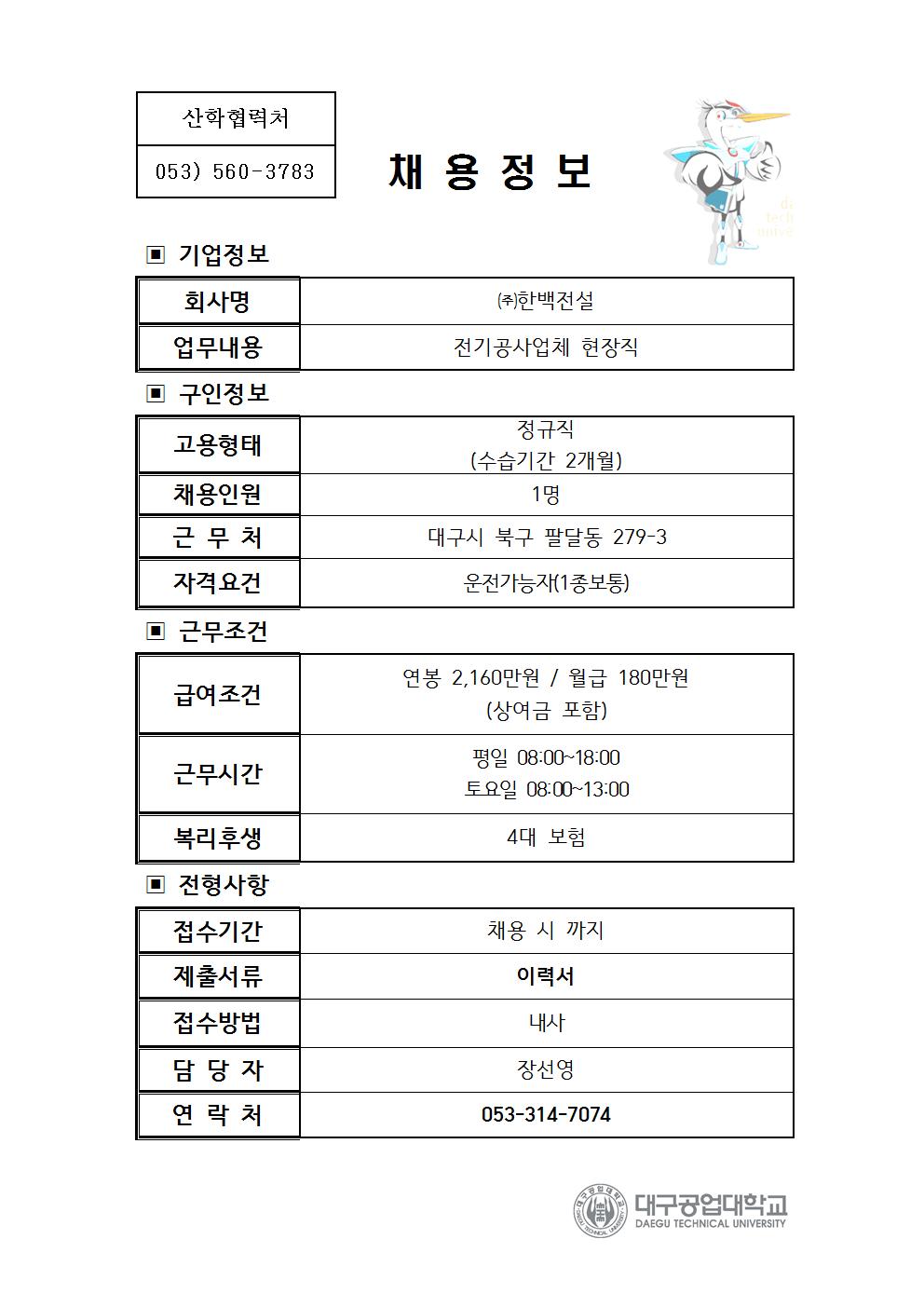 ○ 지원과 관련하여 궁금한 사항은 산학협력처 취업지원팀 053-560-3783으로 문의 바랍니다.
