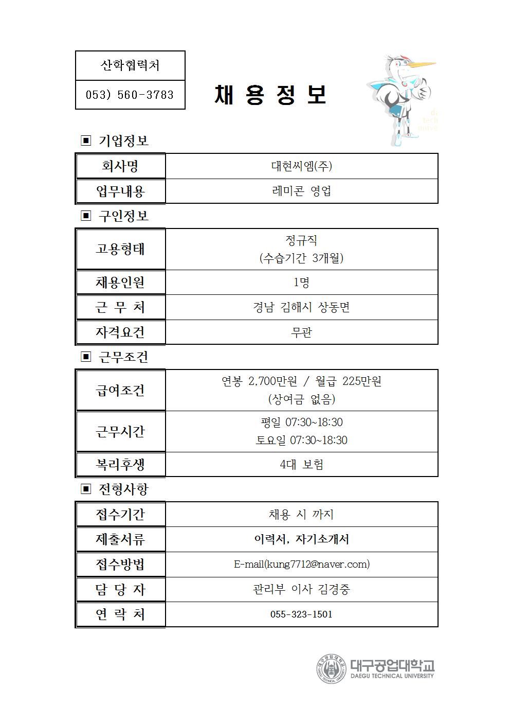 지원을 희망하는 학생은 산학협력처 취업지원팀 053-560-3783으로 연락 바랍니다.