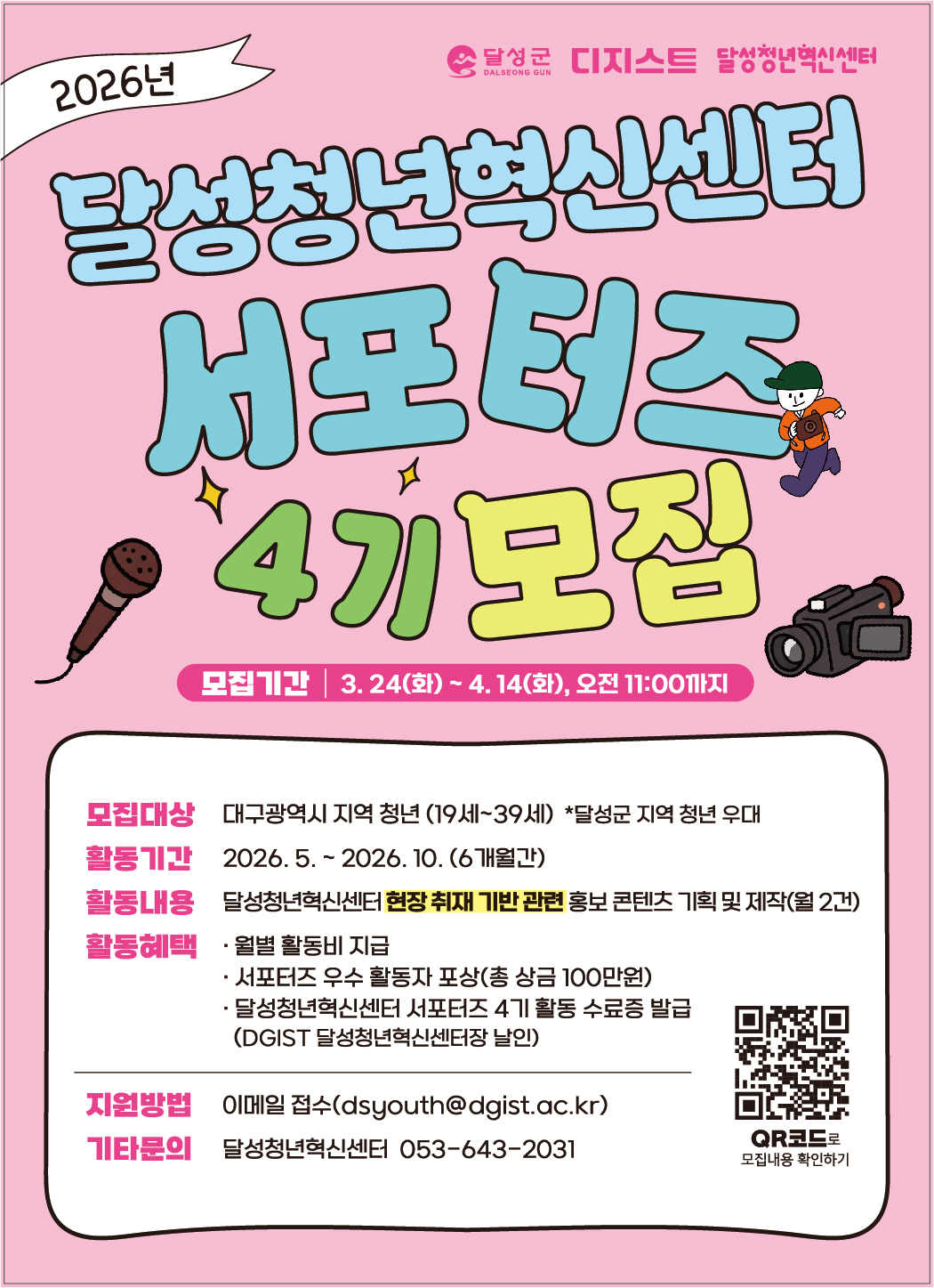 대구광역시 달성군과 대구경북과학기술원이 운영하는 달성청년혁신센터에서 "2026년 달성청년혁신센터 서포터즈 4기" 참가자를 다음과 같이 모집합니다.